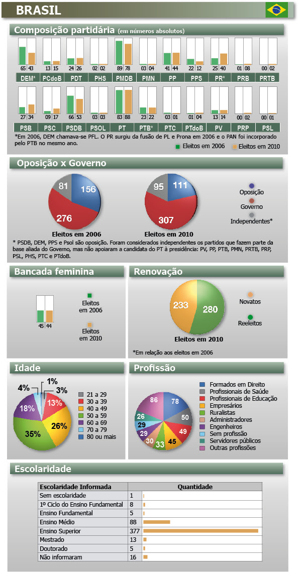 Deputados tomam posse nesta terça-feira pela manhã, e no mesmo dia será eleita a nova Mesa Diretora. Levantamento da Agência Câmara mostra dados globais e por estado, como as bancadas partidárias, a relação entre oposição e governo, profissão e escolaridade dos parlamentares.